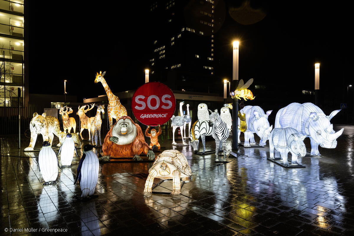Bonn, 5. 12. 2022 – Wenige Tage vor Beginn der Weltnaturkonferenz im kanadischen Montreal, demonstrieren Greenpeace-Aktivist:innen heute auf dem Platz der Vereinten Nationen in Bonn für besseren Naturschutz. Vor dem UN-Gebäude haben sie von 12 bis 18 Uhr lebensgroße Leuchtfiguren von unter anderem Giraffen, Nashörnern, Zebras, Orang-Utans und Faultieren aufgestellt. Auf Bannern fordert diese “Konferenz der Tiere”: “Rettet unsere Zukunft!” Dazu zwitschert, brüllt und summt es auf dem Platz. “Seit 30 Jahren reden die Vertragsstaaten darüber, dass das Artensterben gestoppt werden muss. Doch bisher ist viel zu wenig passiert – weltweit, in der EU, aber auch in Deutschland”, sagt Greenpeace-Waldexpertin Sandra Hieke. “Nicht einmal drei Prozent der Wälder in Deutschland und weniger als ein Prozent aller europäischen Meeresgewässer sind vor industrieller Ausbeutung geschützt.”