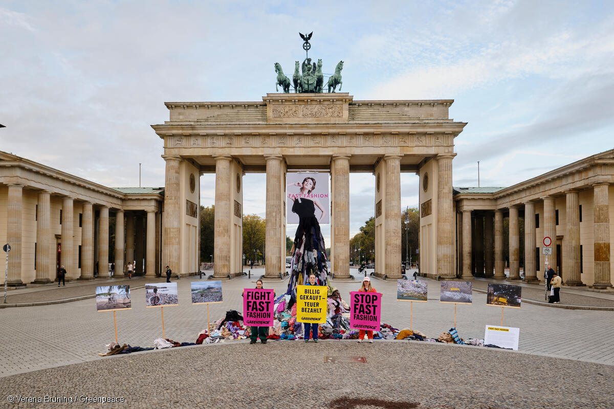 Berlin, 22. 10. 2025 – Für ein Anti-Fast-Fashion-Gesetz demonstrieren heute zehn Greenpeace-Aktive mit einer fünf Meter hohen Kunstinstallation aus Klamottenmüll vor dem Brandenburger Tor. Der Anlass: In rund einem Monat werden Modekonzerne während der Black Week den Kauf von Wegwerfkleidung mit aggressiven Rabattaktionen weiter anheizen. Auf einem Banner warnen die Aktivist:innen: „Fast Fashion: Billig gekauft, teuer bezahlt“. Die Installation, nach einem Entwurf von der Künstlerin Emanuele Jane Morelli, besteht aus Textilien, die Greenpeace aus den Müllbergen des Kantamanto-Markts von Accra in Ghana gesammelt hat. Er zählt zu den größten Second-Hand-Märkten der Welt, wo Altkleider auch aus Deutschland zu immer größerer Umweltbelastung führen. Eine Ausstellung rund um die Installation zeigt die vermüllte Landschaft in Ghana. „Fast Fashion steht für ein Wirtschaftssystem, das Ressourcen verheizt und Menschen im globalen Süden mit unserem Müll alleine lässt. Das muss ein Ende haben“, sagt Thilo Maack, Umweltexperte bei Greenpeace.
