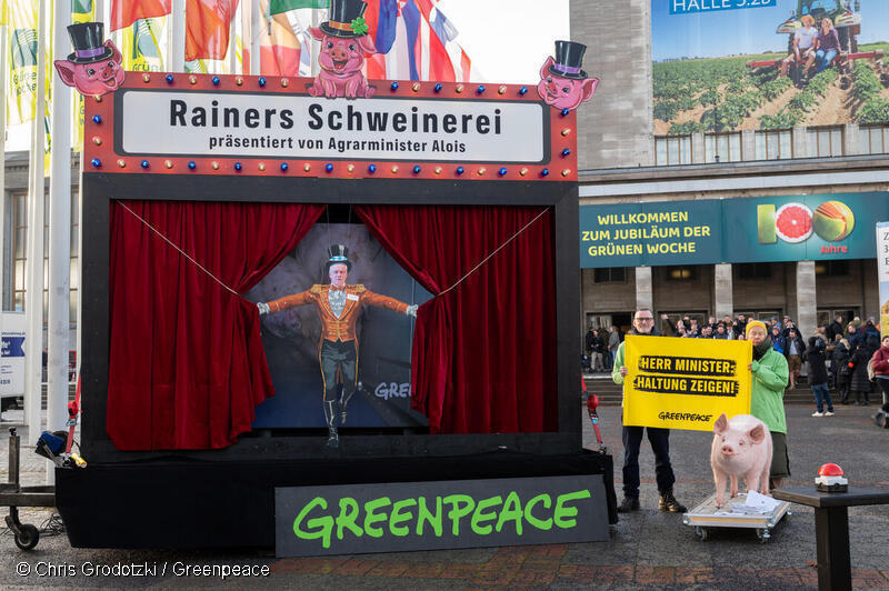 Berlin, 16. 1. 2026 – Damit die Beendigung von Tierleid in Ställen nicht länger blockiert wird, protestieren heute zwölf Greenpeace-Aktive zur Eröffnung der Grünen Woche. Bundeslandwirtschaftsminister Alois Rainer (CSU) verschiebt und verwässert derzeit das Gesetz zur verpflichtenden Haltungskennzeichnung von Fleisch- und Milchprodukten und streicht Fördermittel zum notwendigen Umbau der Tierhaltung. Vor dem Nordeingang des Messegeländes zeigt ein Jahrmarktwagen den Minister als Hampelmann der Fleisch- und Milchindustrie. Die Figur versucht immer wieder, den Vorhang vor eine 3 mal 2 Meter große Videowand zu ziehen, die Aufnahmen aus Schweineställen der tierschutzwidrigen Haltungsform 2 zeigt. “Herr Minister: Haltung zeigen!” fordern die Banner der Aktivist:innen.